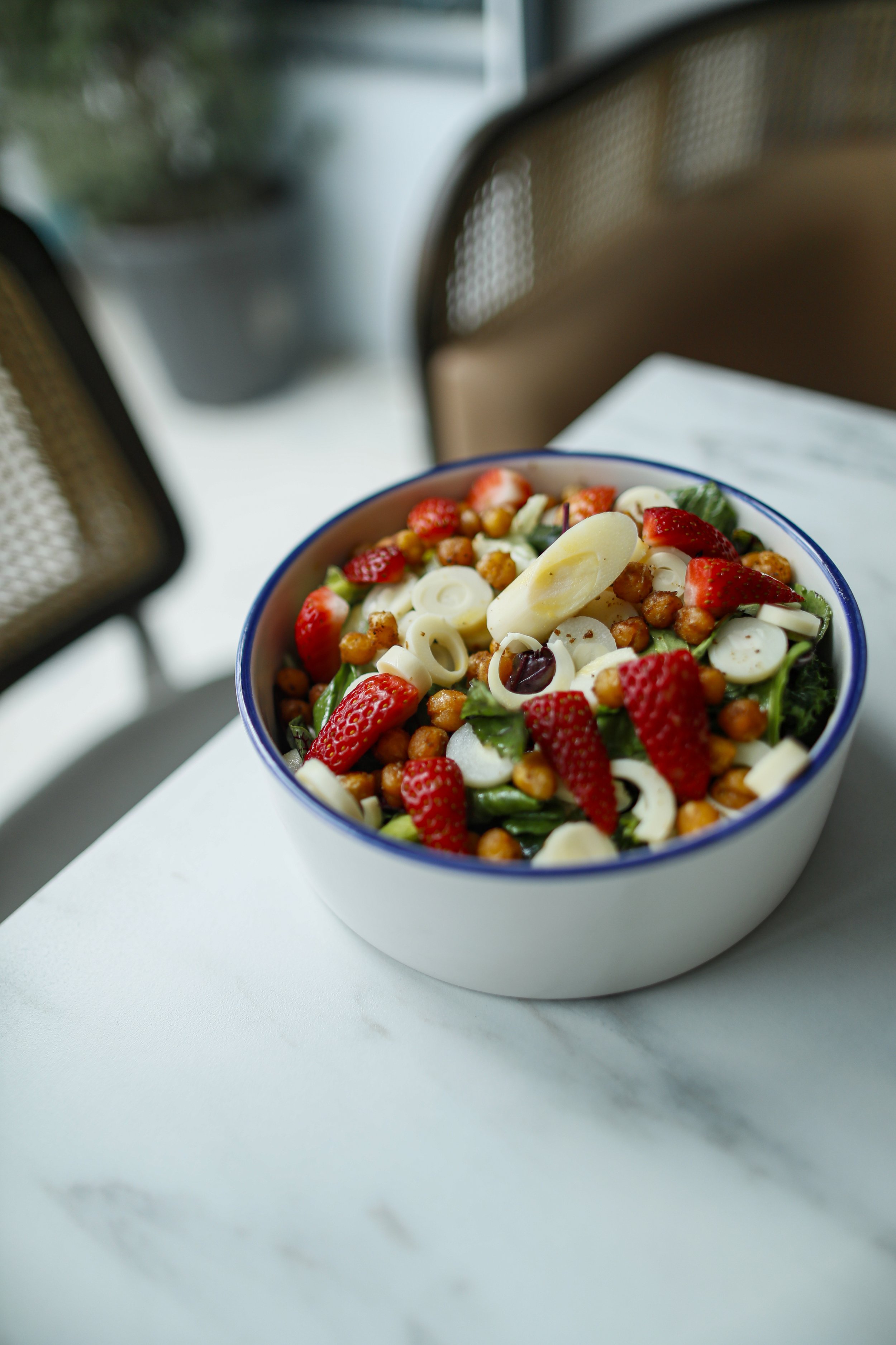 Mixed leaves | blue cheese | heart of palm | cherry tomatoes | strawberries | lollo Rosso |Arugula | kale maple Dijon dressing |orange dressing